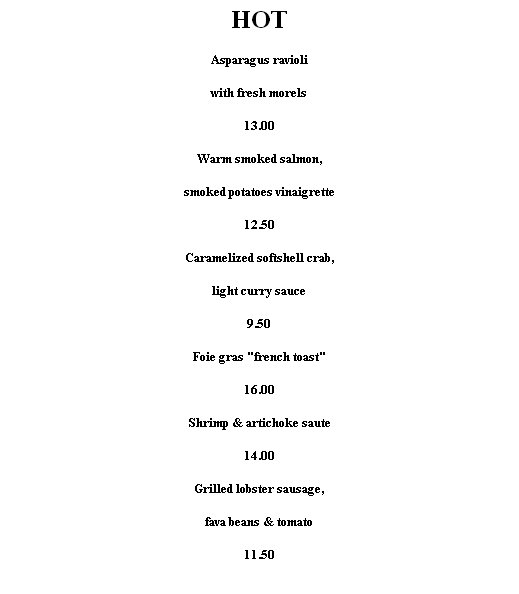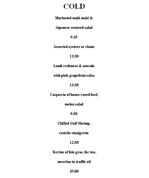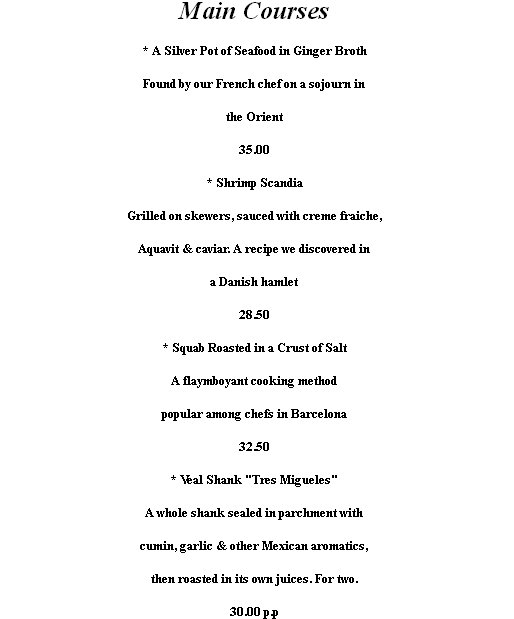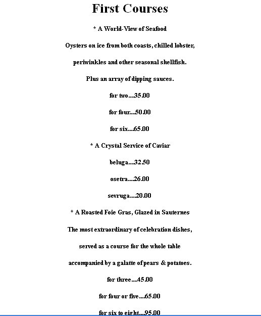 Non era certo il migliore locale della città (ai tempi furoreggiava Sirio Maccioni e il suo Le Cirque, Mario Batali con Babbo e l’emergente Nobu) ma certo era quello che faceva i maggiori incassi ! scartabellando parecchio sono riuscito a ritrovare un menù anni “80 con i relativi prezzi che ricopio qui: