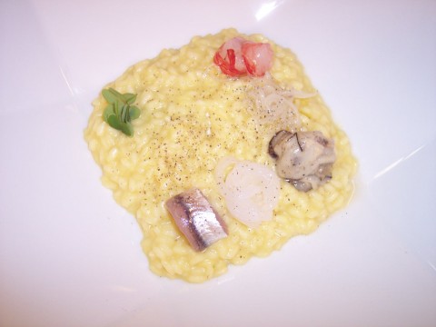 – postare il pesce sul risotto e finire il piatto con il falso pepe