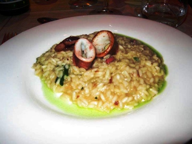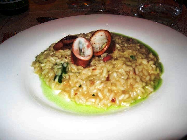 In una casseruola tostare il riso con un pò di olio extra vergine e scalogno, portare a cottura con il brodetto di cozze, intanto, saltare in una padella antiaderente molto calda per pochi secondi i totani marinati.