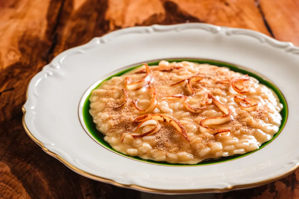 risotto alle pesche e ultimare con olio al cipollotto, polvere di limone