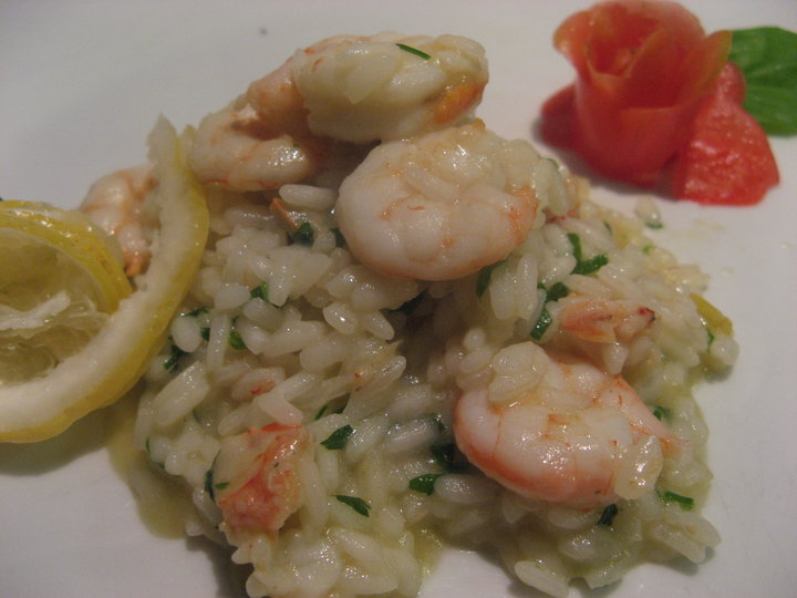 Dorare un spicchio di aglio in olio extra vergine di oliva. Eliminarlo, aggiungere una parte di gamberi e farla saltare velocemente in padella, a fuoco spento una grattata di