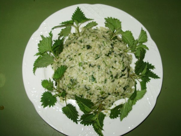 Usare dei guanti perchè questa pianta possiede delle proprietà urticanti che poi perde non appena viene calata nell’acqua bollente per lessarla. Intanto iniziamo a tostare il riso in un soffritto di burro, olio e cipolla. Dopo circa dieci minuti incominciare ad aggiungere brodo vegetale precedentemente preparato con cipolle, patate, carote, sedano, zucchine, e qualche pomodoro.