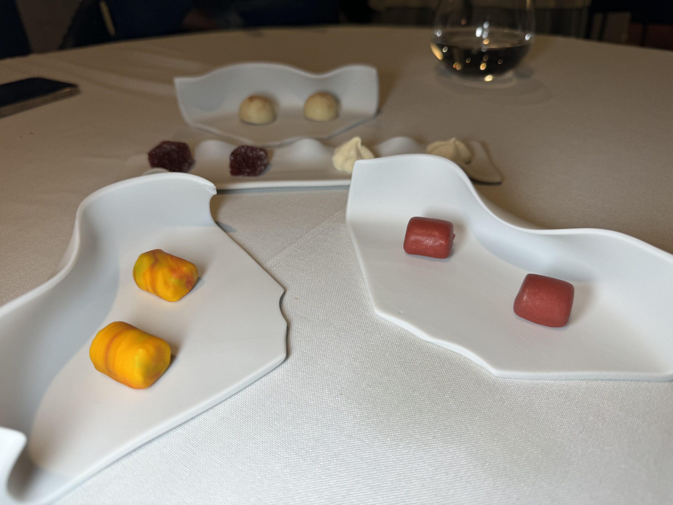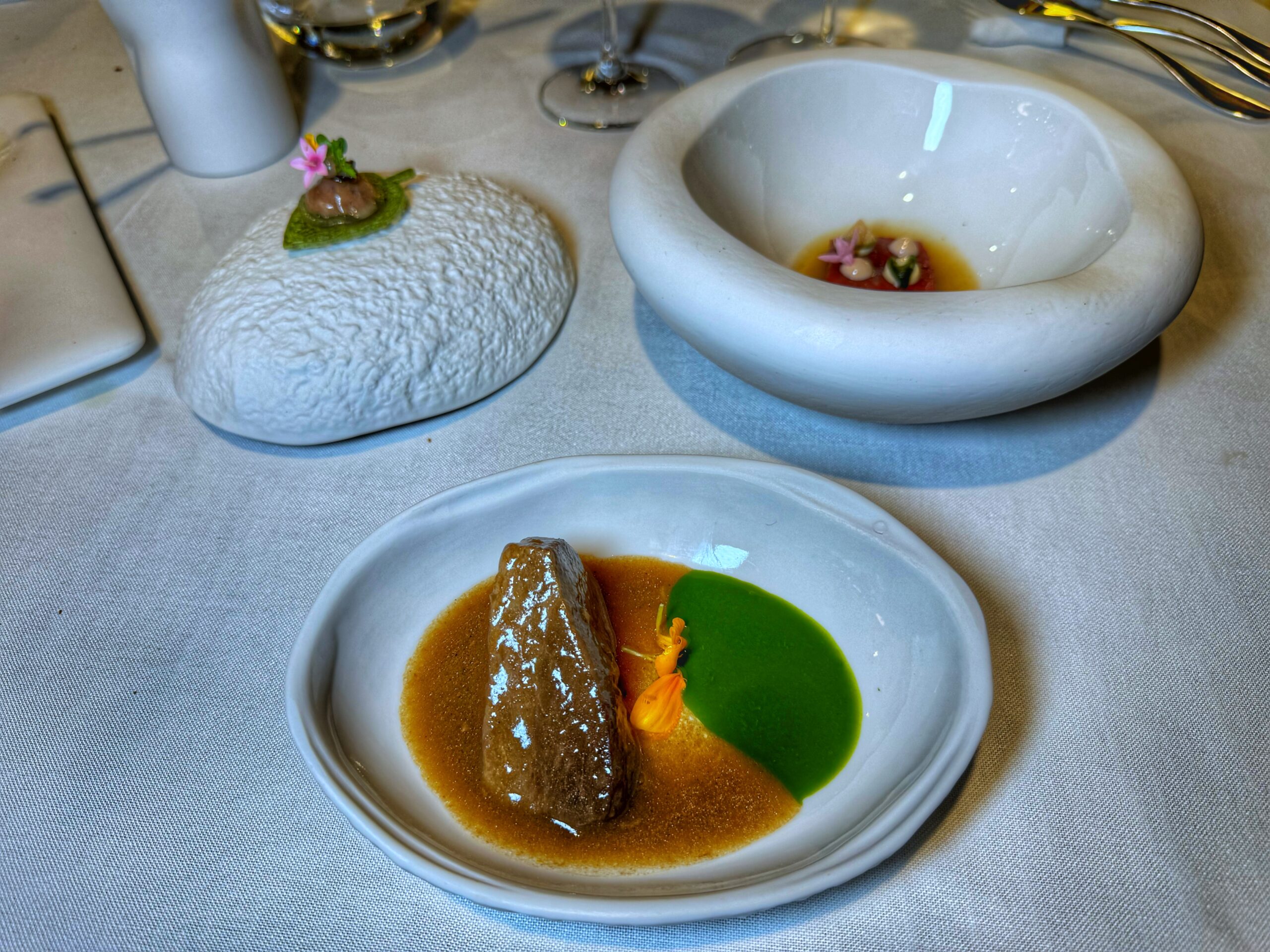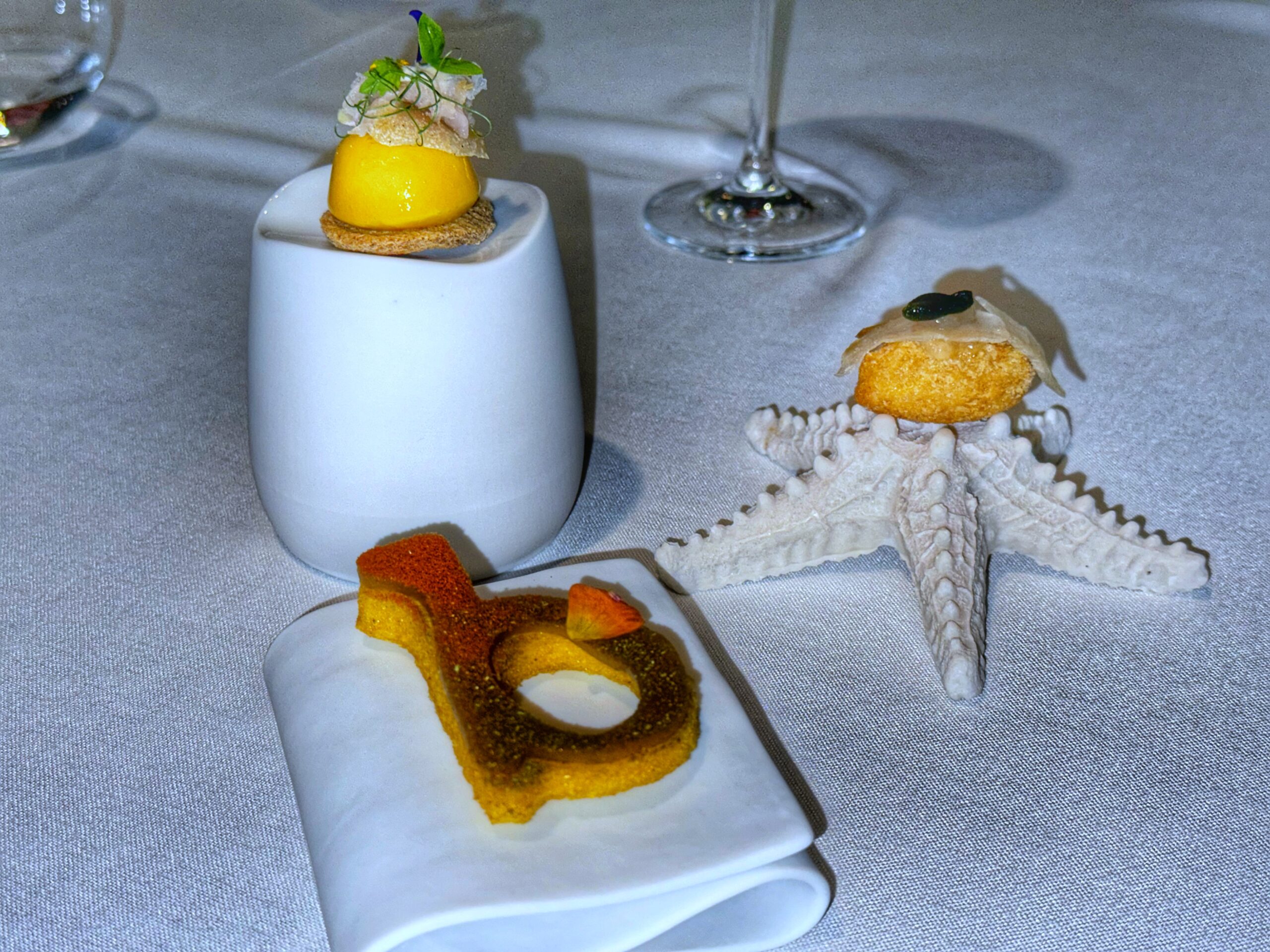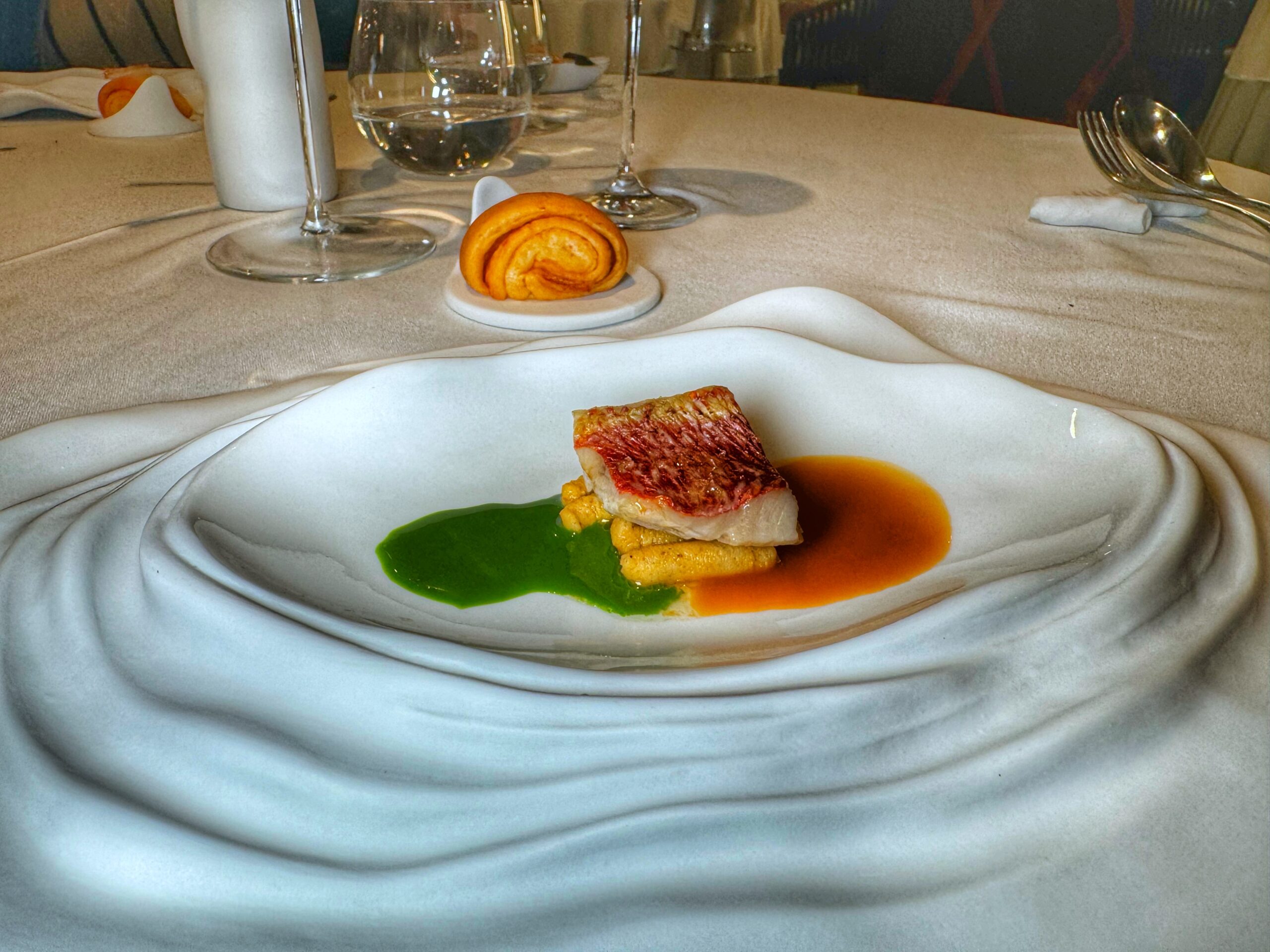 Seguono il passatello con una potente riduzione di cacciucco, davvero incisivo, e l’anguilla affumicata con zucca e lampone, forse un po’ troppo dolce. Il Risotto “Bocconcino” è con crema di ostriche e alga con maracuja locale, i tortellini sono con parmigiano 42 mesi e tutti gli ingredienti a crudo come insegnava nonna Renata (“a 94 anni si ruppe una spalla, dopo un mese era qui con me a fare tortellini”, dice Niki), e le paste ripiene sono i plin con genovese di coniglio canario, salsa di peperone e salmorejo; e i bottoni alla carbonara dove torna protagonista il guanciale di cerdo locale.