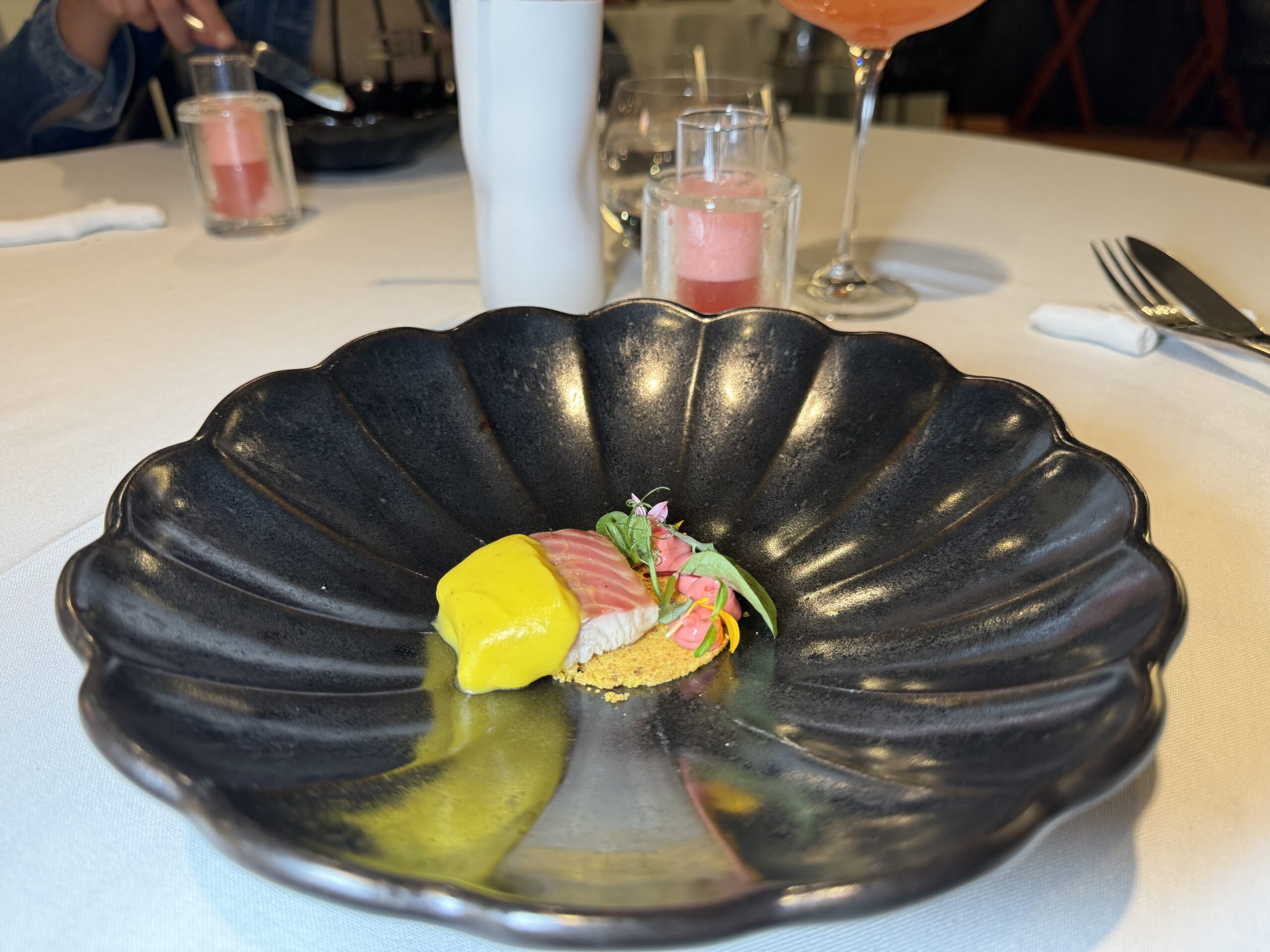 Dopo la selezione di pani fatti in casa e olii di varie cultivar, l’inizio è Homenaje al atùn, con il tonno vitellato omaggio a Antonino Cannavacciuolo con maionese alle acciughe, garum e riduzione di vitello.