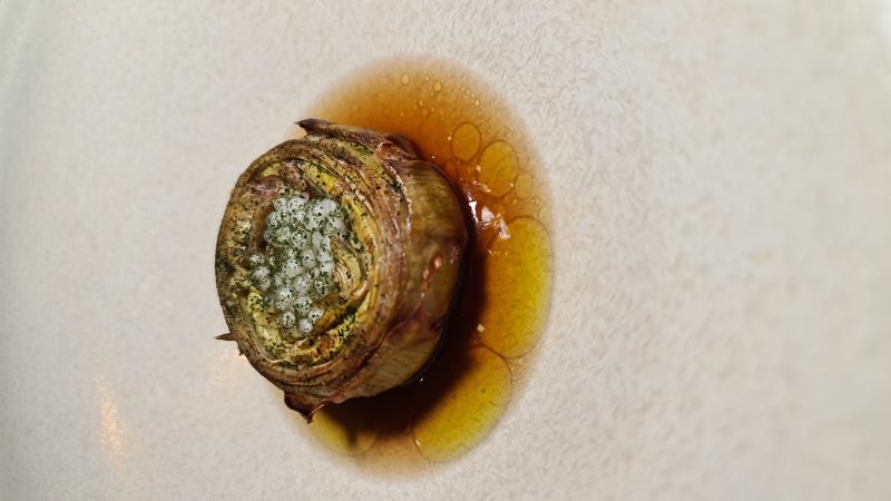 - Carciofo, tartufo nero, brodo di carciofo alla griglia. Piatto verticale, senza concessione a nessun tipo di orpello.