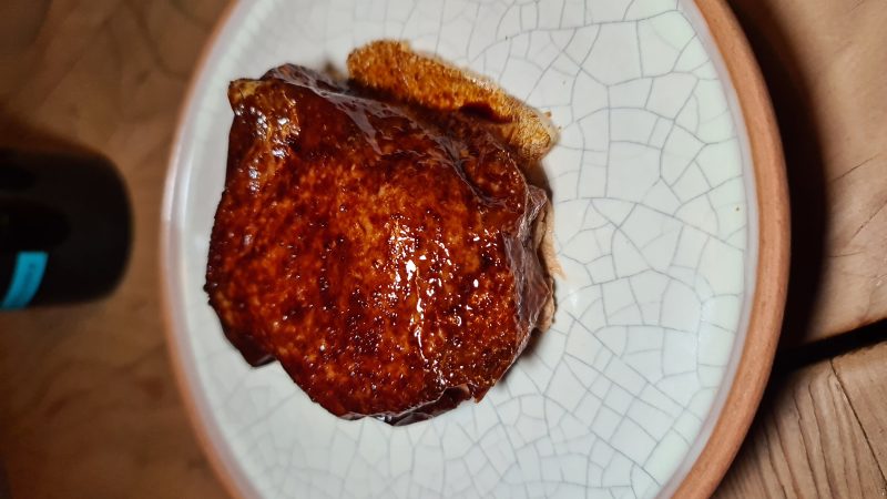 - Trottole cotte in brodo di lische affumicate, cime di rapa, conciato di mandorle e aringhe. Mano felice sulle paste, tanto che negli anni passati l’ha portato a vincere anche il Contest Primo Piatto dei Campi. La pasta viene portate a cottura, non c’è mantecatura. Le trottole sono un formato di pasta difficile, hanno bisogno di un condimento importante per reggere la loro cartella. In questo caso gli ingredienti sono un tapis roulant che esaltano la pasta. Note amaricanti, sapidità spinta, un leggero affumicato e la nota quasi ossidata delle mandorle che con un procedimento simile a quello del conciato romano cambiano il loro sapore. Ho fatto il bis. Meraviglioso.