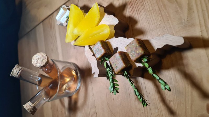 - Ostrica alla brace marinata nella sua salsa con vino di pasta. Davvero buona questa versione dell’ostrica, accompagnata dall’ippocrasso (bevanda alcolica) di vino di pasta, felice invenzione dello chef procidano.