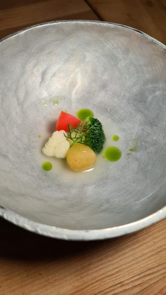 - Sgombro in salamoia, raviolo di acciughe arachidi, salsa di Tumminia, meringa salata e sarda affumicata. Complesso, su più livelli e su più assaggi, ci convince per la perfetta cottura dello sgombro, ma anche per la salsa di arachidi che accompagnano i ravioli di acciughe. Un piccolo viaggio, intenso, nel mondo del pesce azzurro.