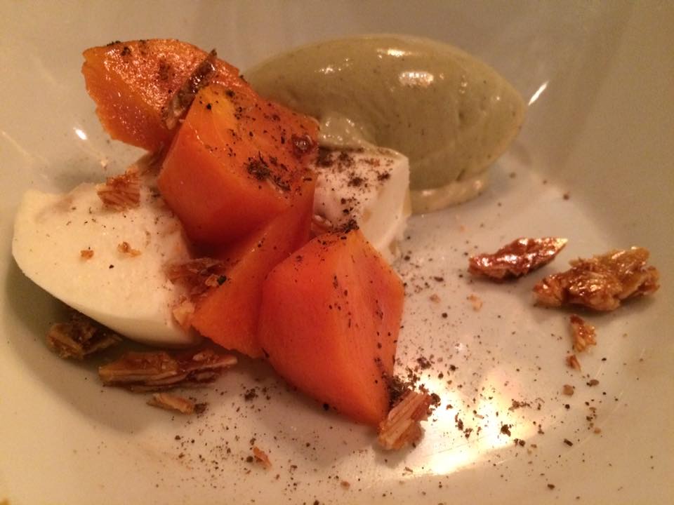 A Mere,dessert ai cachi, croccantino e gelato di pistacchio