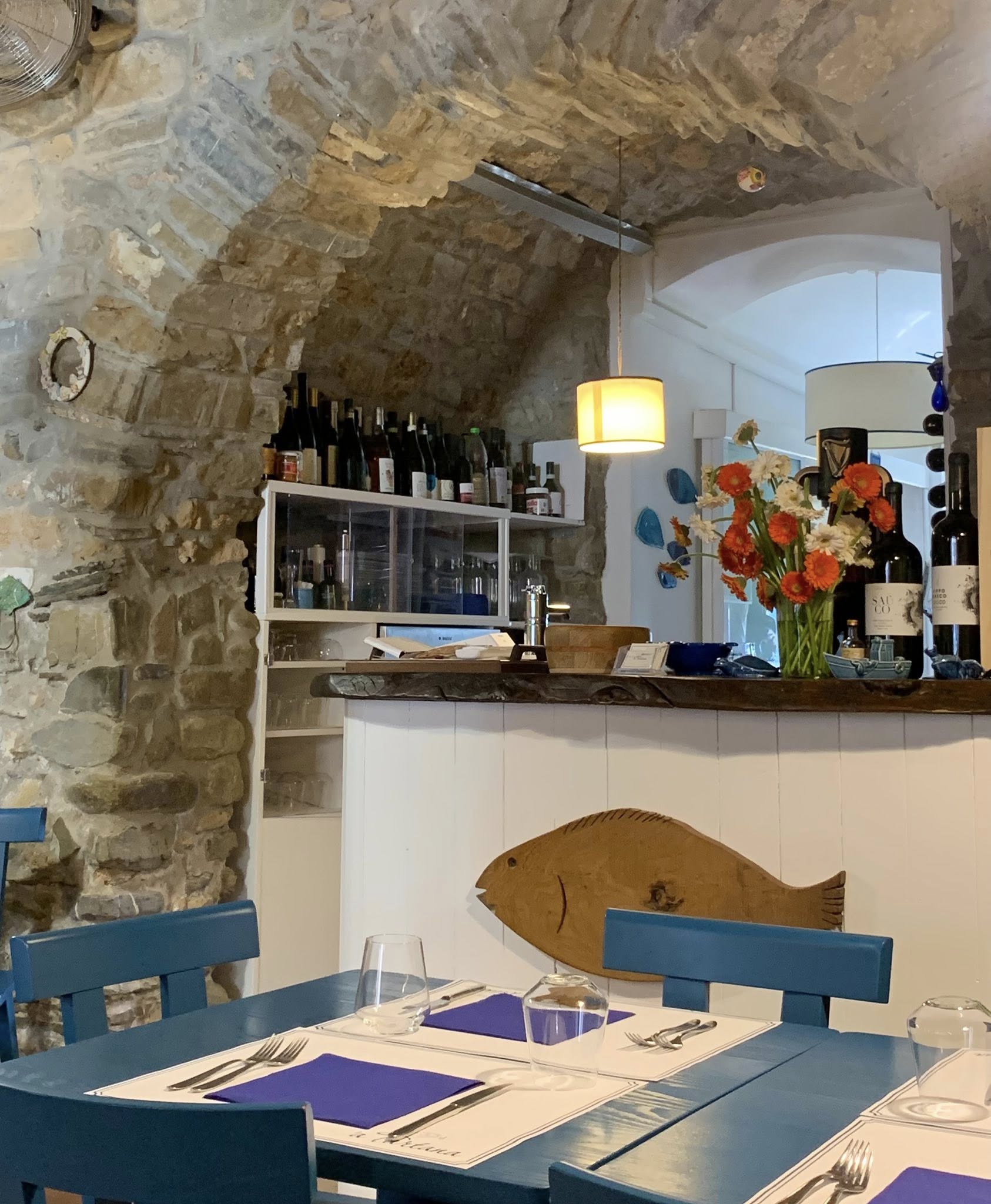 Ambiente piccolo e raccolto (c’è però una sala gemella di fronte), pareti con pietra a vista e tavoli azzurri, fiori freschi al banco, accoglienza casalinga.