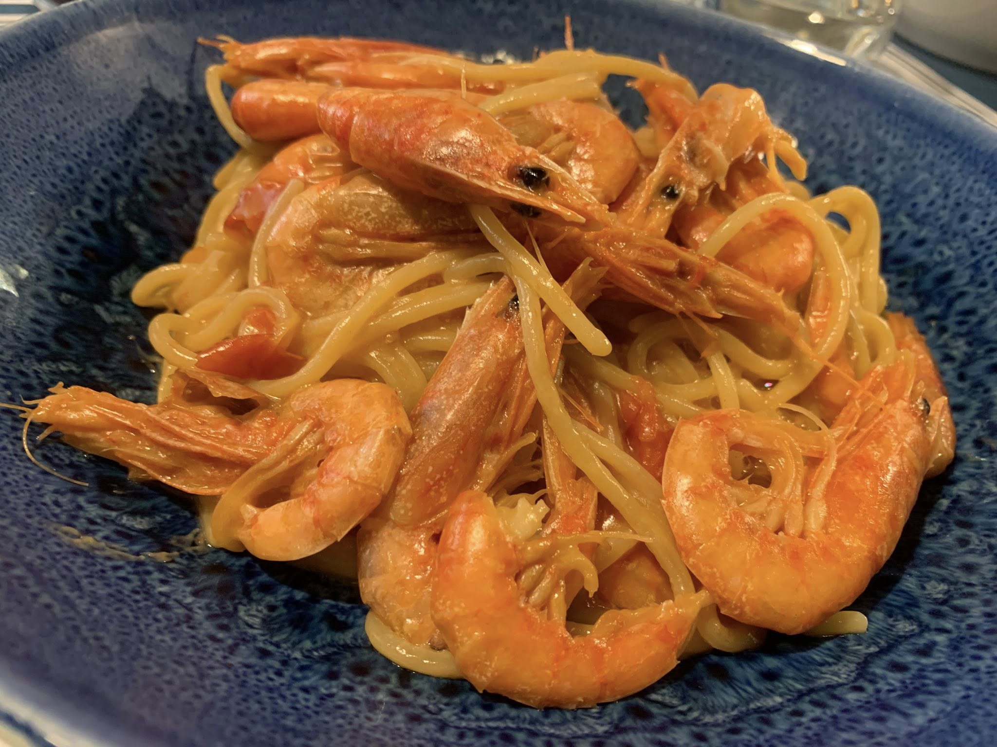 Dopo tutto questo ben di Dio basta un solo primo per appagare le papille gustative, intramezzato tra le varie portate: spaghetti ai gamberi rossi. Un piatto imperdibile, sostanzioso, fresco e raffinato.
