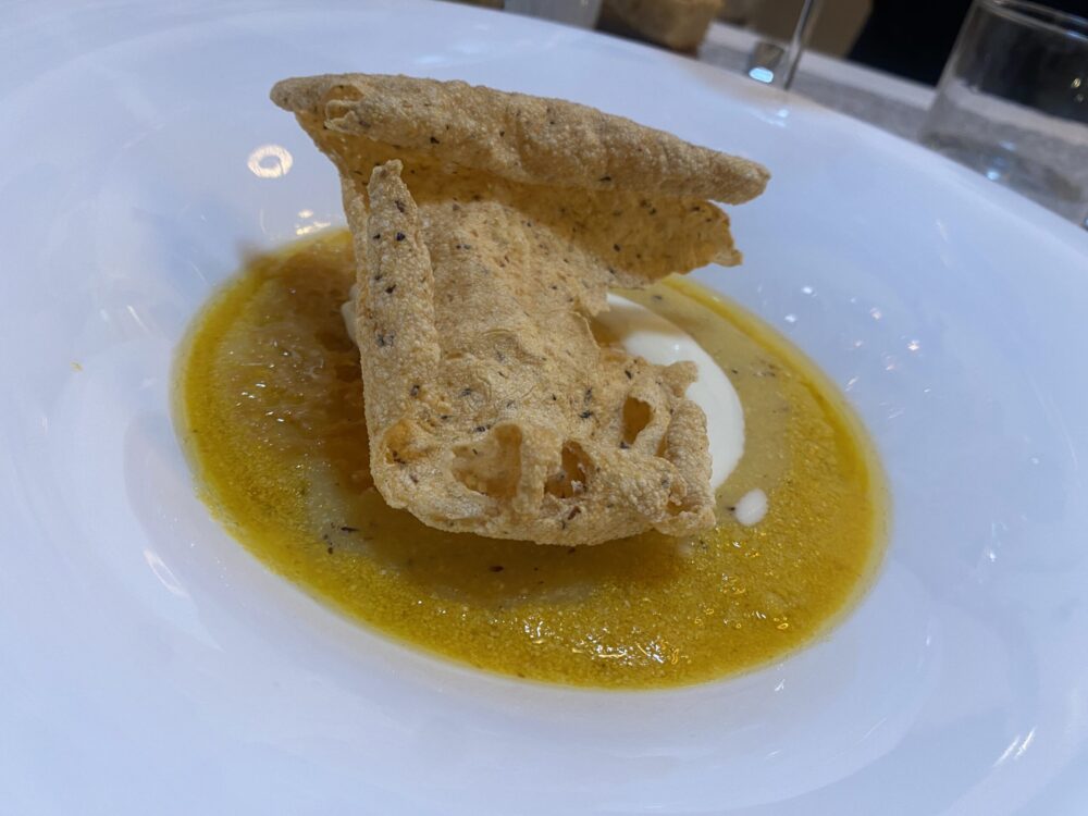 C’è l’Oro del Friuli, interpretazione del “toc in braide” con formaggi di malga e montasio in tre consistenze, con cialda di frico e polenta morbida del Molino Caeran di Codroipo e chips di mais “Cincuantin”.