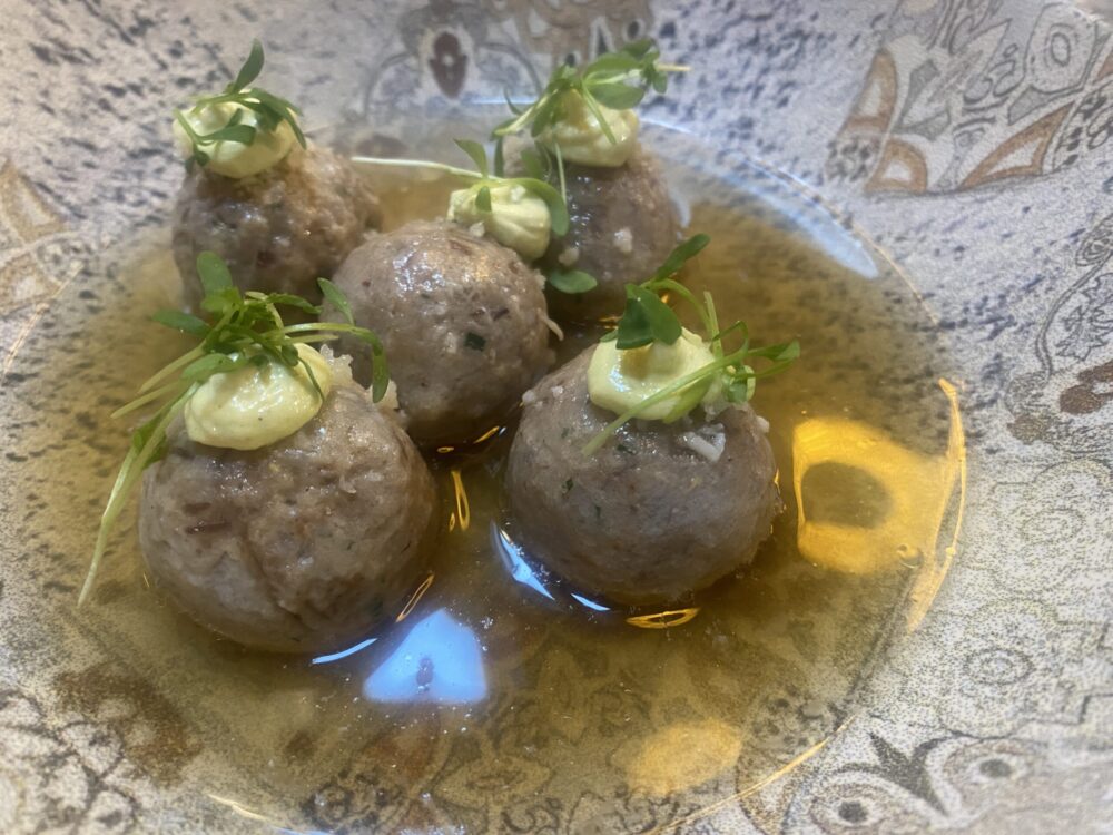 Ancora, i canederli di fegati in brodo con erba cipollina, secondo la ricetta dell’Orso, e gli immancabili “Cjalsons” con mele, patate, e un mix di erbe e spezie segreto e variazioni di stagione, con ricotta affumicata di malga e brodo di mele, davvero magistrali.