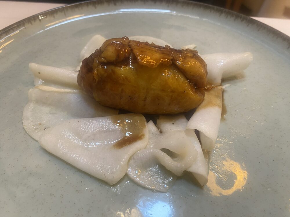 Ancora, il collo del pollo riempito di testina di vitello su carpaccio di rapa bianca servito con le sue cosce fritte: un piatto dimenticato delle civiltà contadine, invero presente anche nel centro Italia (si pensi al collo del papero ripieno in Toscana) che dimostra la grandezza delle nostre cucine regionali.