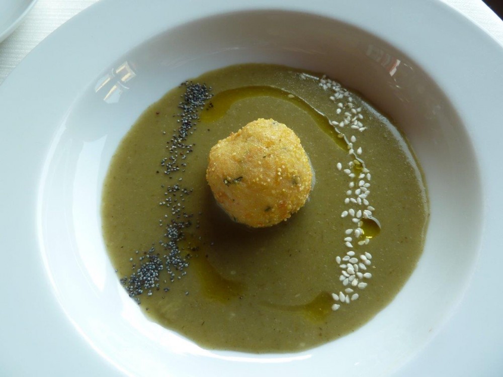 Al Vigneto, con un calice di bollicine Marchesi Antinori, ne seguiranno altri, il benvenuto della cucina, golosa crocchetta di gamberi e salmone su crema di carciofi con semi di papavero e sesamo, apriti stomaco, si comincia.