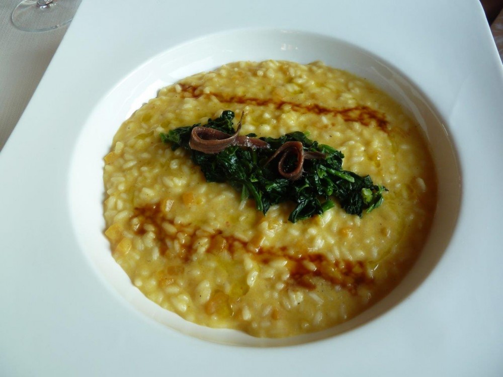 Al Vigneto, risotto mantecato alla zucca, spinaci e acciughe, cottura e temperatura di servizio adeguate, la sapidità dell’acciuga che interrompe piacevolmente la dolcezza della zucca, forse ininfluenti gli spinaci per chi, come il sottoscritto, non cerca freschezza in un risotto