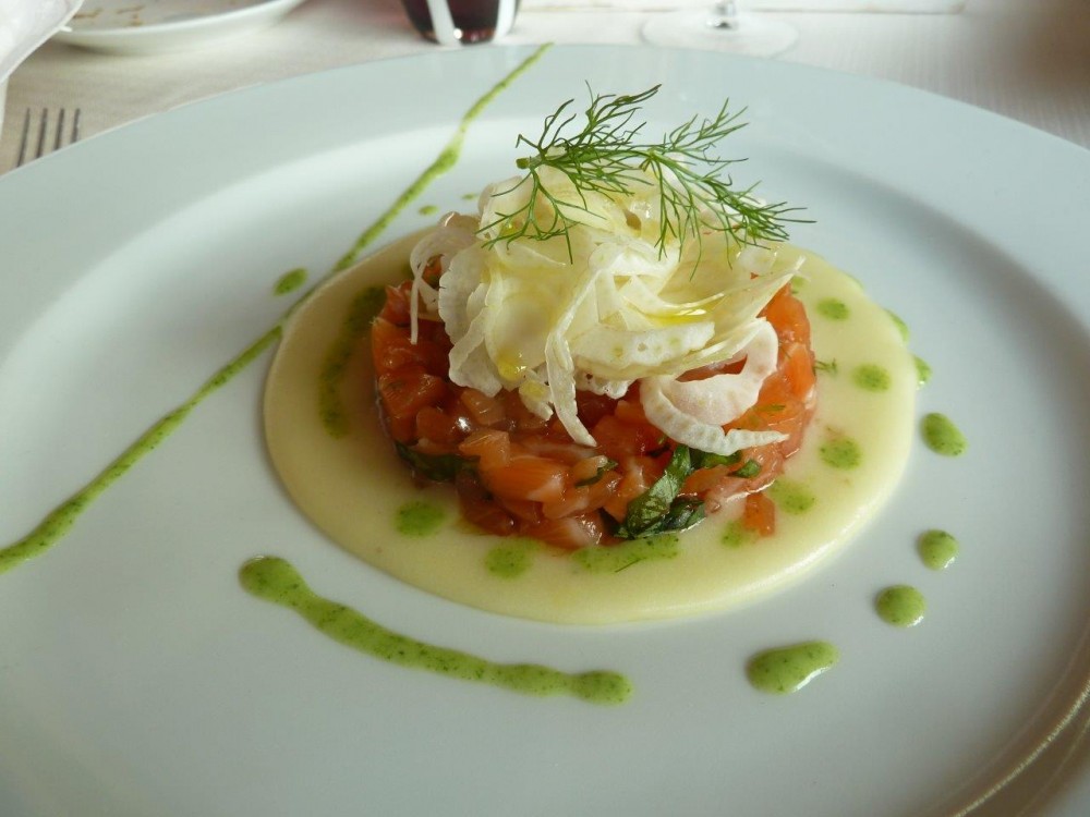 Al Vigneto, tartare di salmone e finocchi su cremoso di patata, per presentare un gran piatto, a volte, non è necessario inventarsi alcunché, ottimo impatto visivo e risultato gustativo