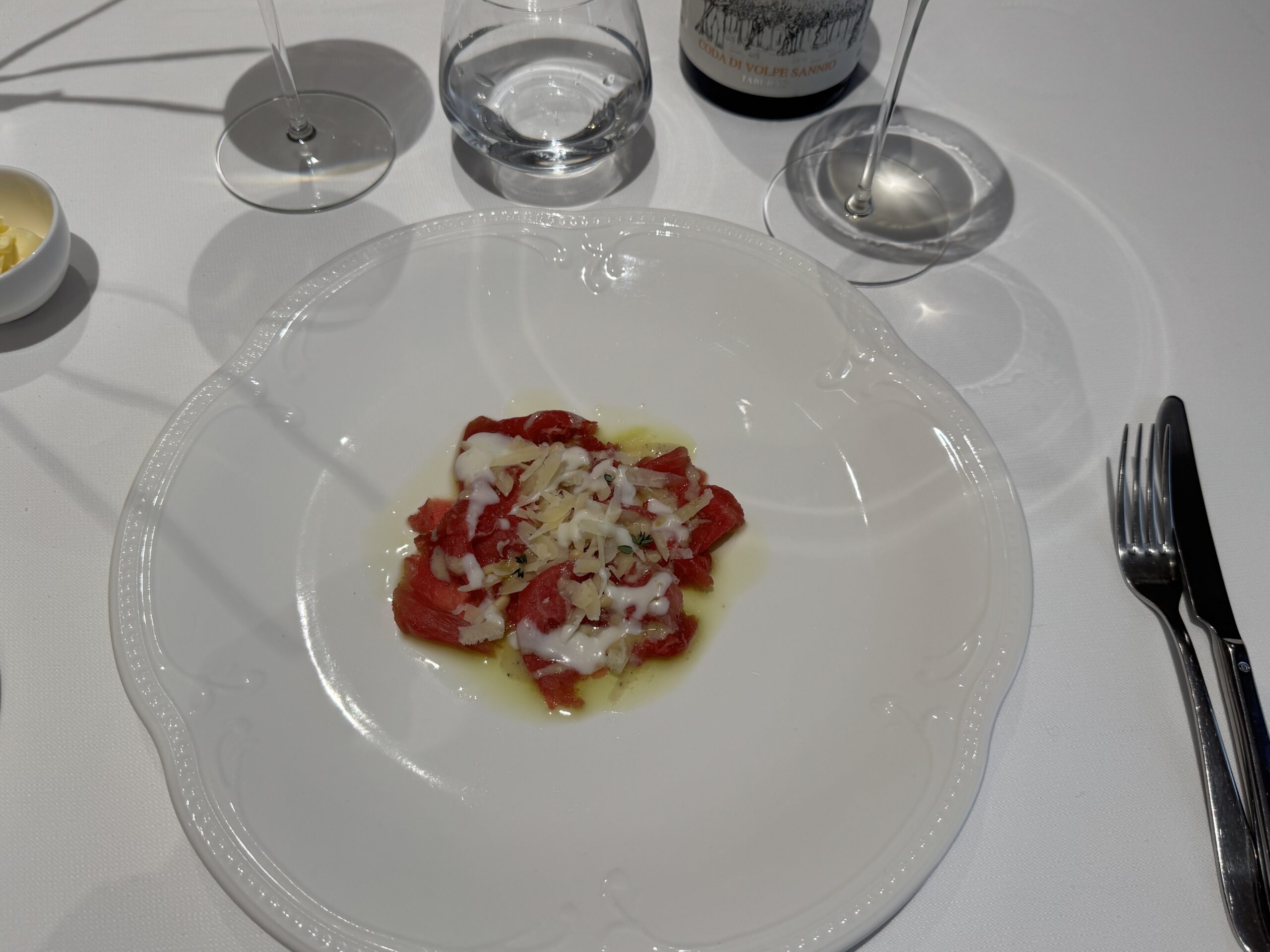 Carpaccio AmA : Vitello, Latte di burrata, pesto di pinoli e raspadura di caciocavallo 13/3/2025 Torna a: Ristorante Ama Experience Antum Hotel a Benevento: “condivisione” il menù degli chef Nazzareno Parisi e Antonio Iacoviello Carpaccio AmA : Vitello, Latte di burrata, pesto di pinoli e raspadura di caciocavallo← PrecedenteSuccessiva →