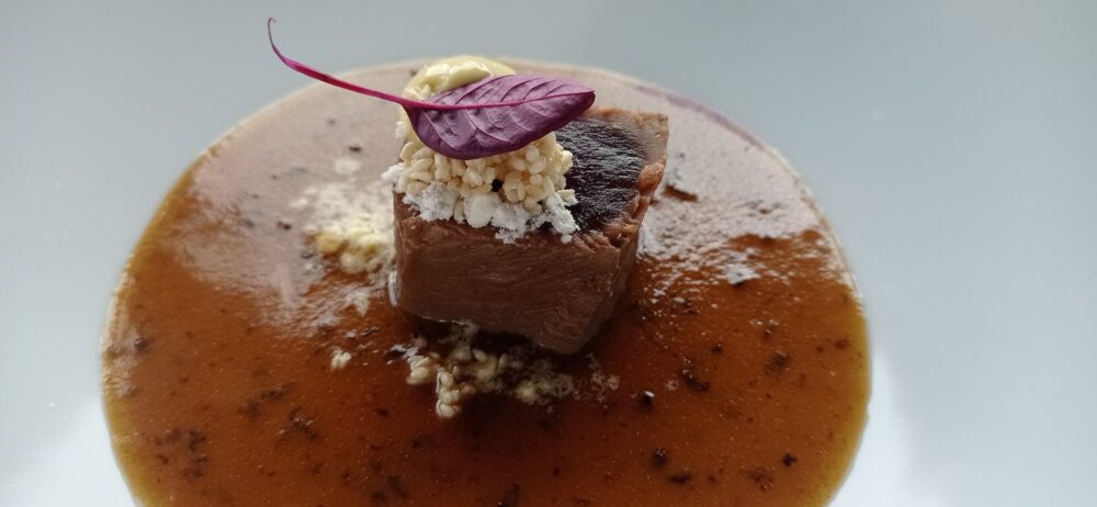 Tonno rosso scottato con sakè e salsa di soia, demi-glacé con salsa ponzu e combava, mayo alle acciughe, olio in polvere e croccante di sesamo.