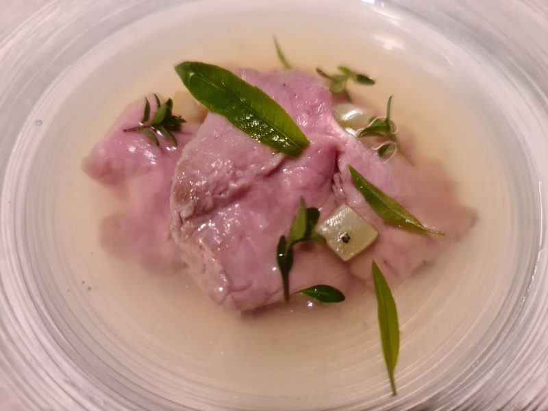 Dei nervetti di manzo al pomodoro, maggiorana e origano, si resta colpiti dal contrasto collagene/grasso, mai invasivo dei nervetti, a quello di acidità/vegetale dei pomodori, la consistenza goduriosa dei nervetti completa l’opera. L’agnello di San Pietro al Natisone, brodo di agnello e limone è spiazzante. Non ci sono salse che coprono il gusto della carne. La sensazione è diretta, anche se poi diventa complessa e affascinante con i bocconi successivi