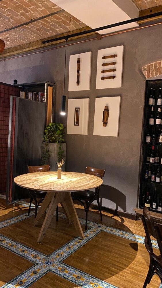 Avvolgente come tutto l’ambiente apparecchiatura senza tovagliato, scelta che valorizza l’artigianalità degli elementi: il legno vivo, il ferro essenziale, la luce che scolpisce senza invadere. Una sobrietà di ispirazione nord europea, gli chef annoverano in formazione un lungo periodo di lavoro nel tristellato Maeem di Oslo, cornice ideale per una cucina ispirata da terra, fermento, pazienza. Una coccola dall’inizio del pranzo fino al momento di indossare i cappotti riposti nel guardaroba riscaldato; un servizio in sala firmato dal garbo di Enzo Cafiero, commercialista in pensione, papà della chef, che le ha trasmesso la curiosità del mangiar bene e occhio attento alla sostenibilità economica del progetto e curatore appassionato della cantina.