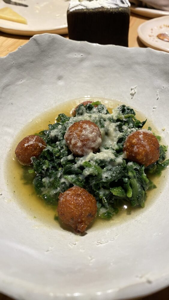 E la “Zuppa, pane caciocavallo” chiaro riferimento al recupero del pane di casa avanzato diventa crostini, un brodo vegetale classico – carote, cipolla, sedano, molto concentrato nel sapore perché estratto senza aggiunta di acqua; scarola, cicoria e borraggine arricchito con piccole pallotte cacio e ova – tipica portata molisana e chiusa con una ricca spolverata di caciocavallo locale. Un piatto emblematico che dice tutto: radici e contemporaneità; tecnica e tradizione; consapevolezza e visione degli chef.