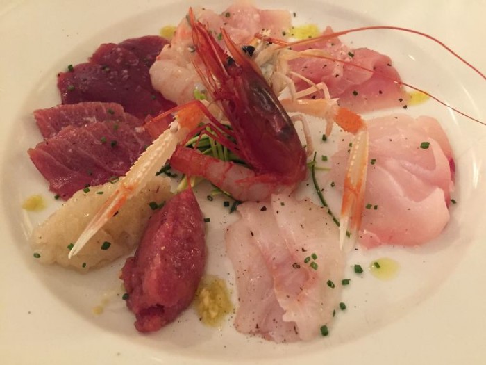 Il locale è accogliente, tante bottiglie in giro e cucina a vista. Da vecchio routinier i crudi, tanto per cominciare.