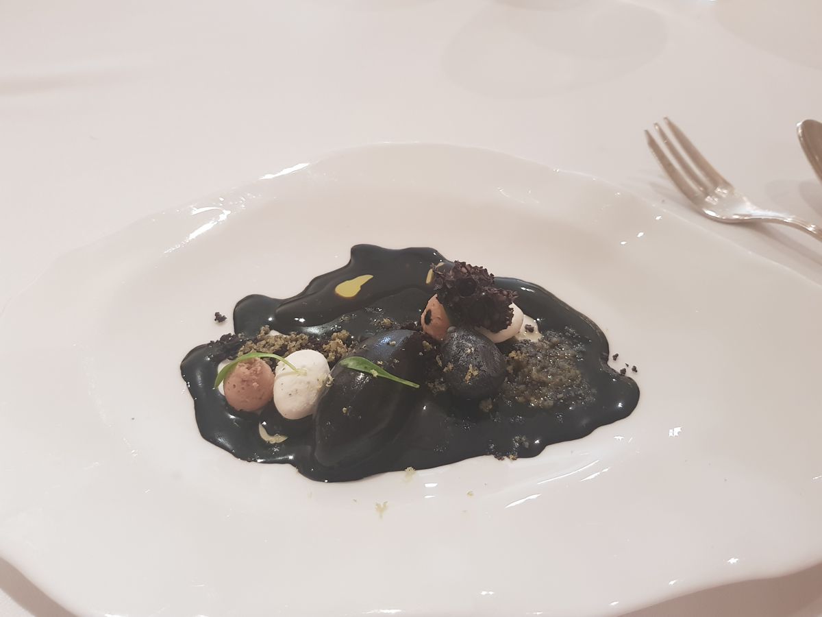 I movimenti geopolitici alternatisi nei millenni lasciano il segno in piatti che hanno la stessa matrice. Cuore di lattuga con noci. Toni amari per questo passaggio interamente vegetale. Uovo con anguilla, salsa topinabur e sangue di gallina. Piatto che cerca di racchiudere in un boccone una concentrazione di grassa dolcezza in molteplici toni.