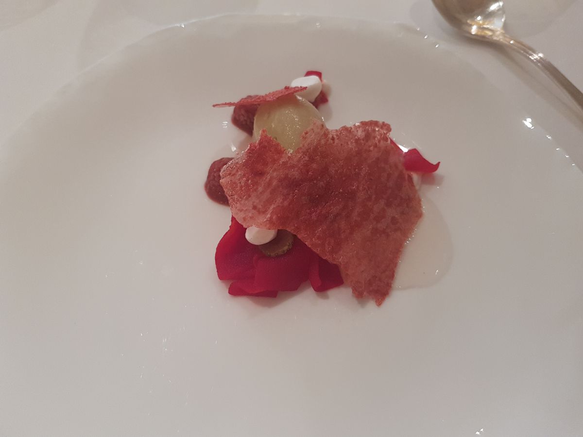 Si continua con un aperitivo molto divertente, dai sassi fatti di ceci e merluzzo alla castagna con tartufo nero per approdare ad una croccante testina di maiale, per me cialda con guacamole e mais, per finire con una tartare di tonno nascosta tra i fiori. I pani, caldi e fragranti, sono accompagnati da burro tradizionale, burro affumicato con cenere di rosmarino, burro con salsiccia e pomodoro.