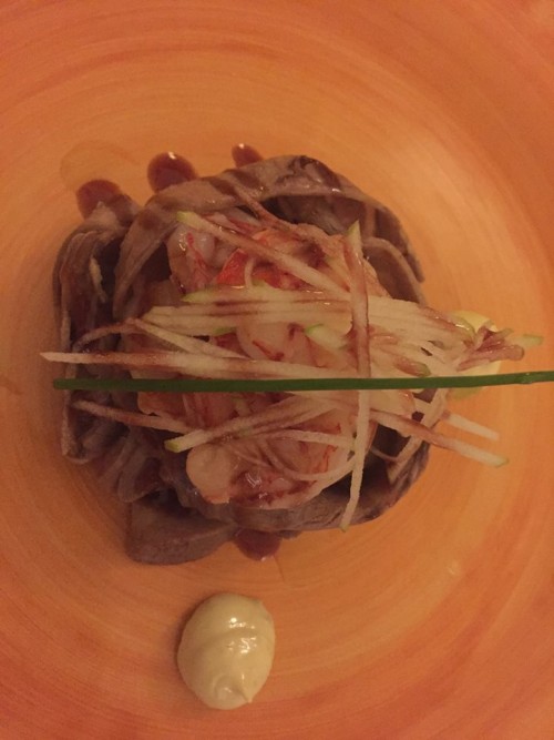 Bikini, Lingua di manzo al Taurasi con gamberi, maionese all’ancienne e mela verde