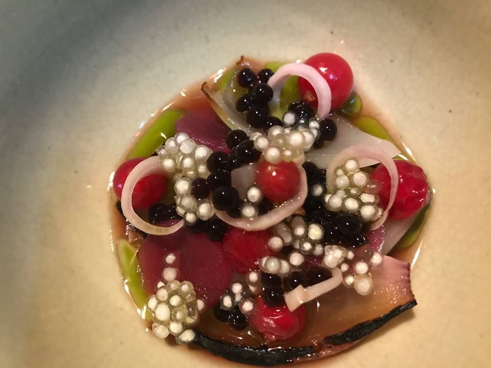Abbiamo scelto il menu degustazione da dieci portate a cento euro. Ed è una esperienza incredibile, che sinora abbiamo avuto modo di fare poche volte in Italia. Faccio outing? Solo da Massimo Bottura e da Mauro Uliassi. Si tratta di una vera e propria sinfonia che apre e chiude con i fuochi di artificio, aperitivo e piccola pasticceria, nella quale i bocconi non sono meno importanti della presentazione. Un solo spartito in cui ogni portata recita un ruolo preciso, non una accozzaglia di proposte. Non c’è ideologia, dicevamo, ma aggiornamento: il vegetale è vegetale, le fermentazioni tanto di moda non sono esibite ma funzionali al progetto del piatto, il rispetto per l’animale è servirlo intero al cliente e non solo nella sua parte più facile, quella che i mediocri omologati comprano bella e imbustata dalle aziende di lusso.