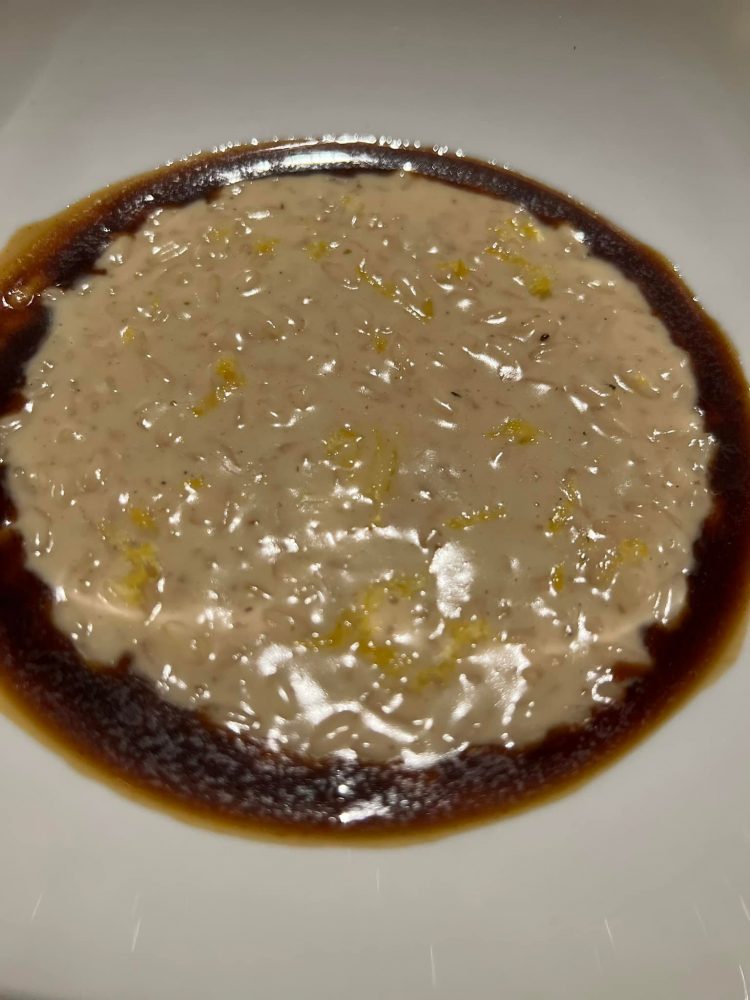 Abbiamo allora finto riso, ossia i semi di pasta che si usava nel brodo per i bimbi con gli elementi della bagna cauda, uno spericolato ma riuscito testa coda sud Nord mentre non mancano agganci storici come il piatto dedicato al grande cuoco Nino Bergese, riso burro e sugo di arrosto modernizzato con la giusta acidità.