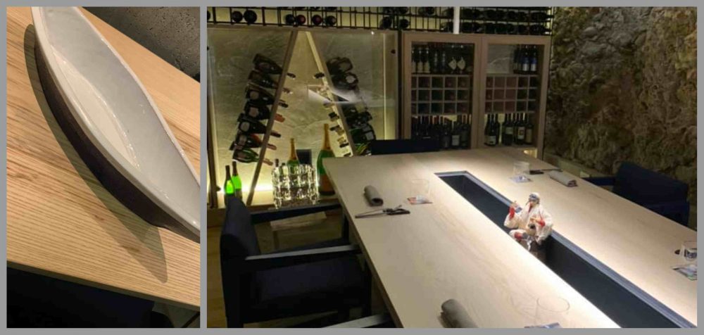 Casamare – il tavolo imperiale della sala riservata. A sinistra, il piatto pensato per la frittura di mare