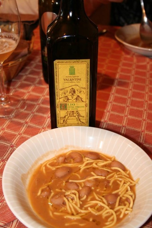 Partiamo dalla zuppa di pasta e fagioli, un piatto “strappalacrime” dal sapore sincero e dai profumi che ti catapultano indietro nel tempo, quando i contadini avevano sempre pronta la zuppa di fagioli o legumi vari nel camino come unica fonte di proteine e calorie per il lavoro nei campi. L’abbinamento con il peperoncino e l’extravergine ci obbliga a un carico di calorie non indispensabile, ma non ce ne preoccupiamo molto pensando sia l’unico primo piatto: aspettativa disattesa con aggravio calorico…