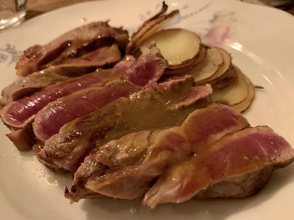 Una certa vivacità anche nei secondi piatti, con un controfiletto di asino cotto alla perfezione e un medaglione di lenticchie rosse con fagiolini e zucchine, profumato agli agrumi, che non fa rimpiangere per nulla le proteine della carne.