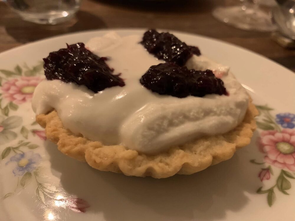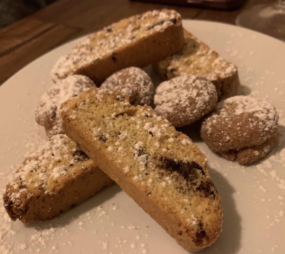 La chiusura dolce ritorna sulle suggestioni della tradizione, con la tartelletta di frolla (buonissima) farcita con ricotta vegetale di mandorle e composta di visciole oppure con la pasticceria secca, con le ciambelline al vino e i tozzetti.
