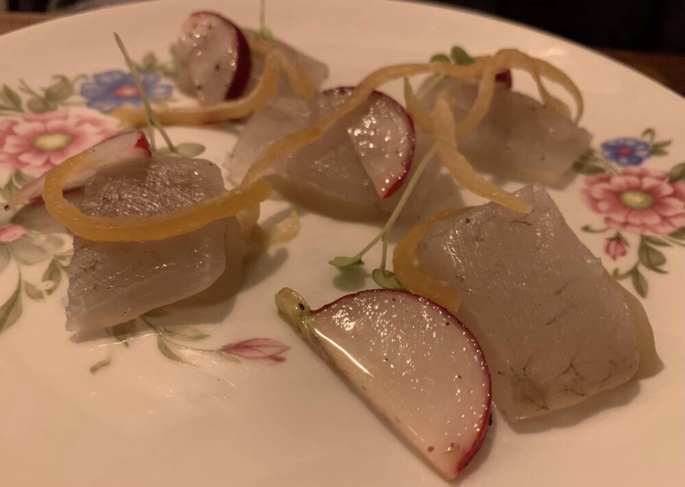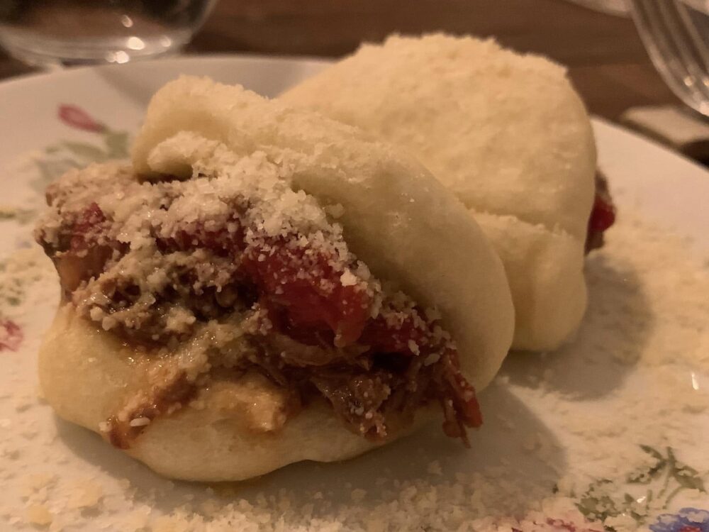 C’è un menu degustazione a 45 euro piuttosto invitante e ben organizzato. Ma la carta nel suo insieme incuriosisce e sollecita a pizzicare qua e là. Gli antipasti sono piccoli piatti a mo’ di tapas, che davvero “acconciano la bocca” e stuzzicano l’appetito, come nel caso del rombo marinato con topinambur, ravanello e cedro caramellato. Non mancano spunti orientali anche se poi picchiapo’ e vignarola che farciscono i soffici bao, panini a vapore fatti da loro, mantengono la barra dritta su Roma.