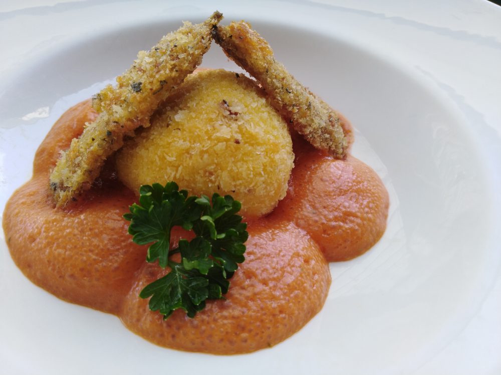 Mozzarella in carrozza? Sì avete capito bene, qui ci vuole il punto interrogativo, perché la presentazione del piatto porta sopra le nuvole una palla di vera mozzarella locale prodotta dal Caseificio Sommese, gestito da gente campana. Una vera goduria. Muller Thurgau Castel Firmian in associazione. Forse qui tutto sommato andava meglio un rosato. Ma va bene così.