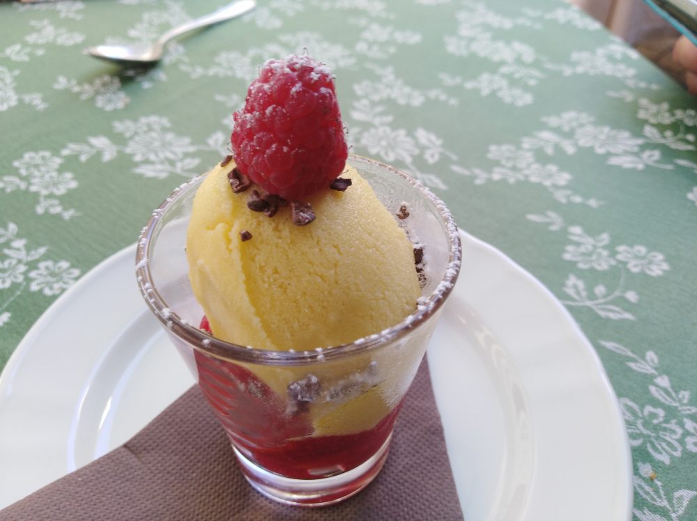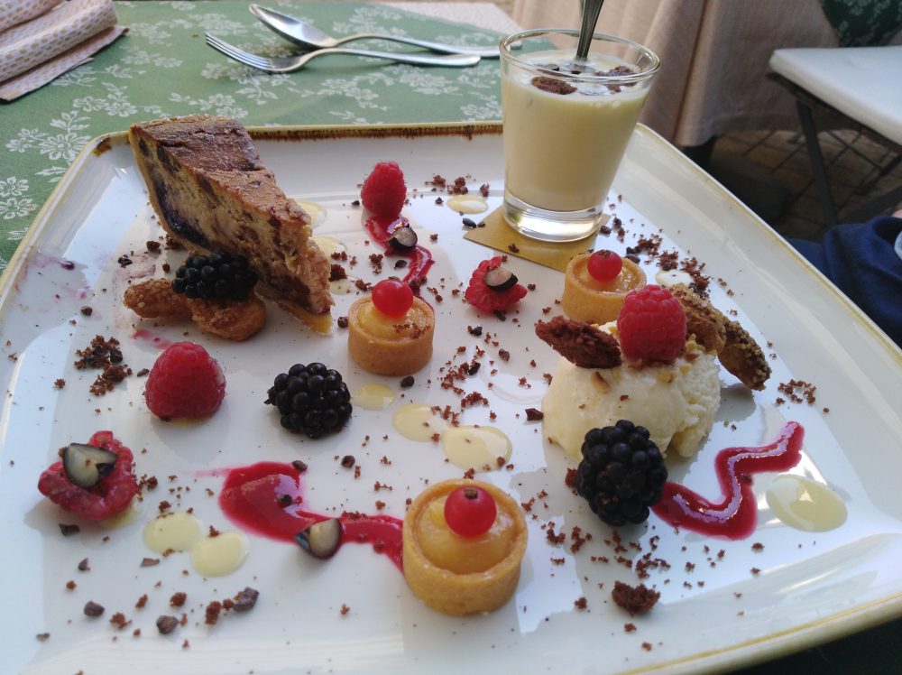 Per finire i dolci della Casa: un predessert con gelato, lamponi e cioccolato e poi il Dolce di Visconti, una bella tavolozza colorata con torta di ricotta, scaglie di cioccolato, confettura di mirtilli e tante altre piccole delizie dolci per contorno. Ottimo davvero. Molto gradito il Passito Liquoroso di Pantelleria di Pellegrino servito sui dolci alla fine del servizio.