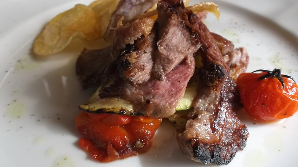 Ristorante Corte Visconti Millefoglie di secreto di Pata Negra alla piastra con pommes saute’ e zucchine