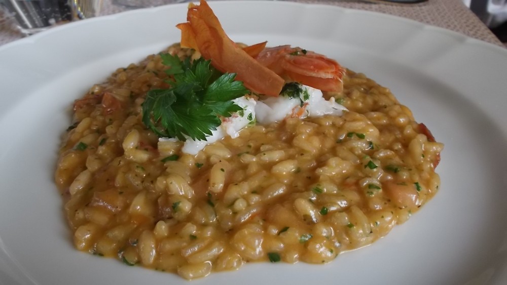 Ristorante Corte Visconti Riso carnaroli mantecato alla bisque di gamberi, consasse’ di pomodori ramati e limone
