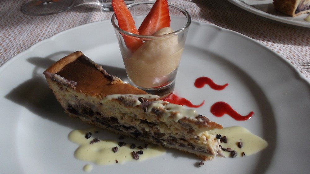 Ristorante Corte Visconti Torta di ricotta, con scaglie di cioccolato, confettura di mirtilli e sorbetto di pesca gialla e fragole