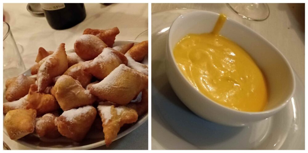 Chiusura tipica di Apricale: zabaione con pansarole fritte agli agrumi, protagonista anche della tradizionale sagra del borgo. Un goccio di amaro e la foto di rito, sazi e sorridenti.