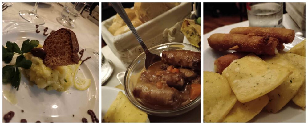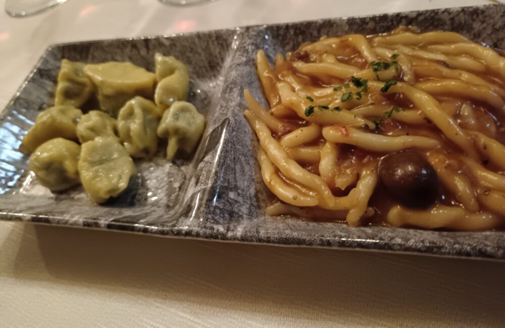 Baccalà e patate con timo, rosmarino e olive taggiasche; assaggio di primi con ravioletto di borragine al burro e rosmarino, trofietta al ragù di coniglio e olive taggiasche.