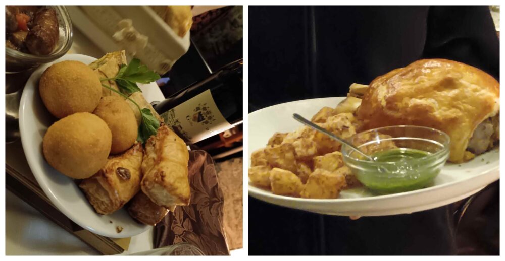 salsiccetta in umido, panissetta di ceci, involtino di formaggio, torta di verdure ripiena di cavolo e verza. E poi — con ironia dichiarata — “non chiamatelo arancino”: una polpettina di riso con cavolfiore e salsiccia.