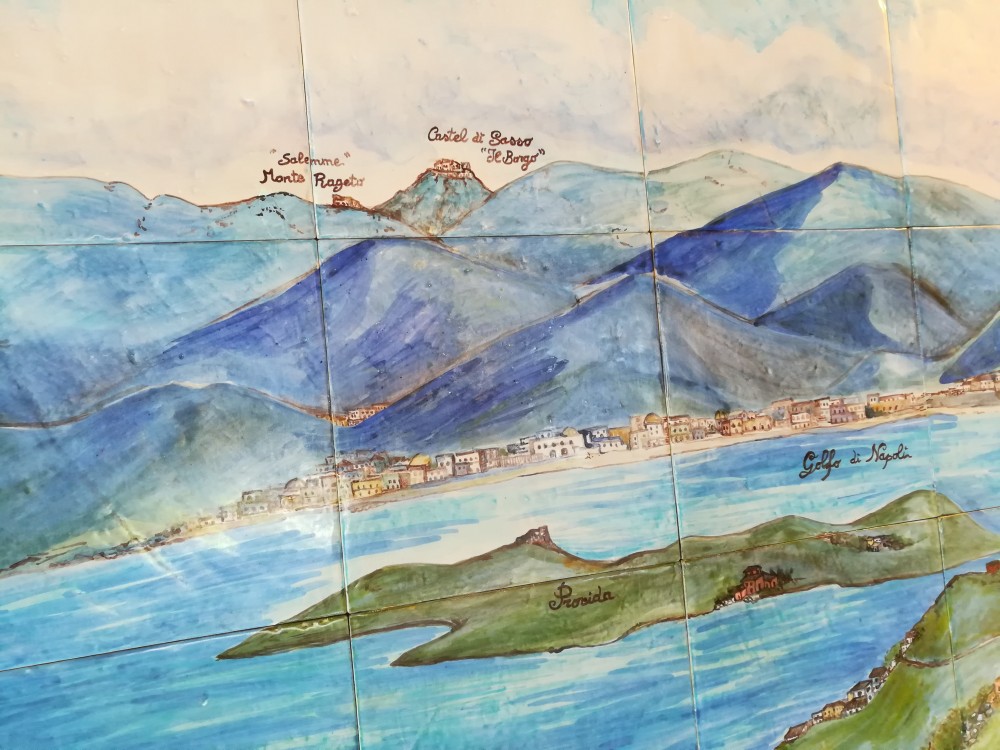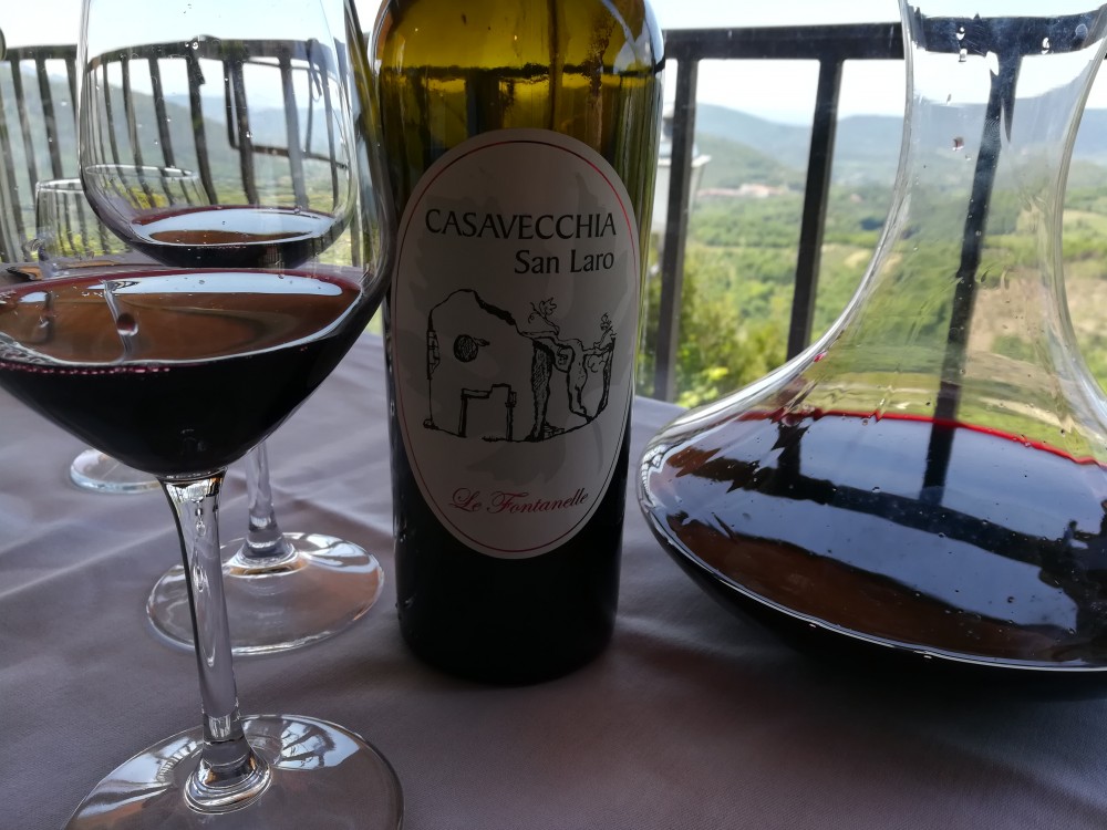 Una volta giunti a destinazione girovaghiamo un pò per il borgo godendo della veduta e dell’aria pura. Verso ora di pranzo ci accomodiamo ad uno dei tavoli posizionati nella veranda del ristorante da dove si continua a godere della veduta mozzafiato sulla vallata fino a scorgere Ischia all’orizzonte, e prima di iniziare a mangiare ci facciamo portare in anticipo una bottiglia di “San Laro”, il vino rosso di punta di propria produzione proveniente da uve dell’antico e misterioso vitigno “Casavecchia”, e lo cominciamo a bere, così, come una sorta di aperitivo per essere avvolti al meglio dai suoi profumi e dalla sua corposità.