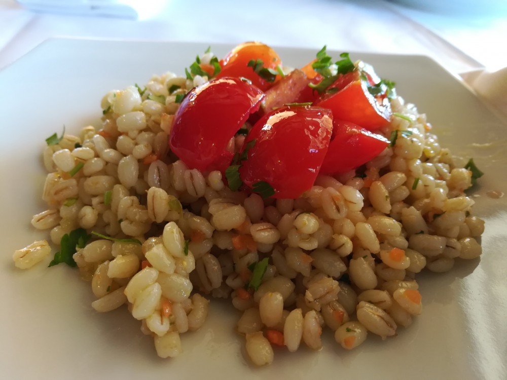 Iniziamo dunque con l’antipasto composto dalla tradizionale minestra maritata servita nella pagnotta di pane che alla fine risulta tutta inzuppata e difficilmente si resiste a non strapparla con le mani e a non mangiarla; sformatino di ricotta e mandorle; sformatino di carciofi; degli ottimi salumi e formaggi con quella ricottina che è un qualche cosa di eccezionale provenienti da aziende rigorosamente del territorio (così come la maggior parte dei prodotti utilizzati, provenienti anche da produzioni proprie); e infine una insalatina di orzo condita semplicemente con alcuni pomodorini e lo straordinario olio che in tale semplicità regala tutte le sue sfumature di profumi e sapori.