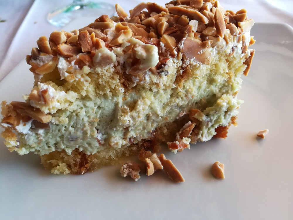 Per finire una millefoglie ai frutti di bosco scomposta nella coppetta e una torta artigianale al pistacchio e ricoperta di scaglie di mandorle.