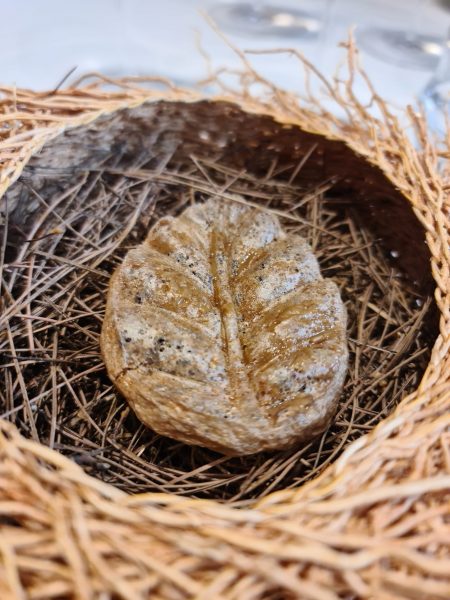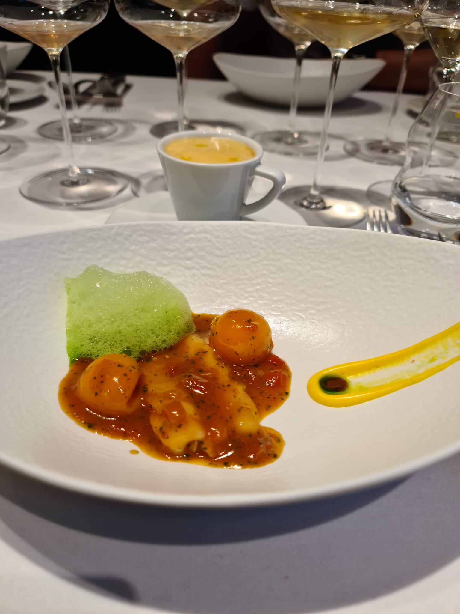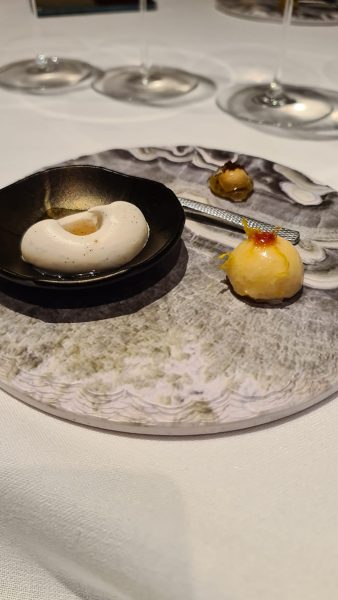 Seguono due assaggi agli antipodi. Concettuale e onirico la foglia di fungo croccante (crunchy mushroom leaf – 2021), godurioso e leggibile il tuorlo dell’uovo fritto da inzuppare in una gelatina di funghi (crispy egg yolk with warm mushrooms gelatin – 2014).