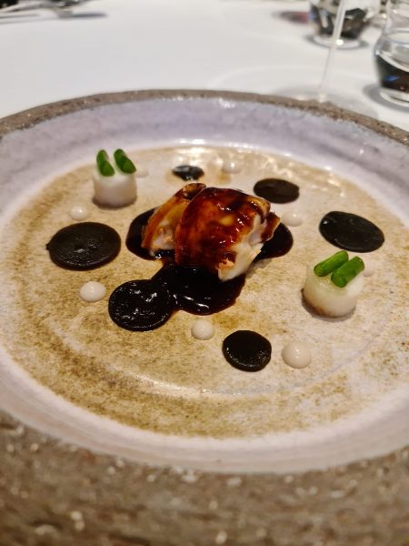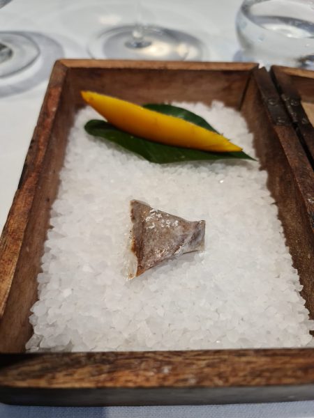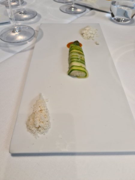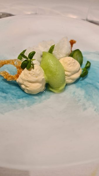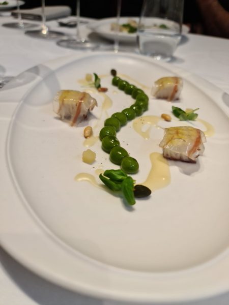 La Gilda del Disfrutar (Disfrutar’s Gilda – 2017) è il piatto del viaggio. Un ode al Mediterraneo ai suoi sapori, al pesce azzurro, alle olive. Tutto assemblato con grazia e un’intensità spaventosa. Oltre alla tecnica ed al buon gusto i tre cuochi spagnoli, in questo piatto colgono anche l’aspetto umanistico della cucina delle genti del Mediterraneo. Una vera delizia. Ancora un passaggio tutto al vegetale con gli asparagi, fiori di sambuco e macadamia. (Asparagus with edelrflower and macadamia – 2021)